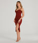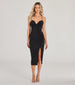 Captivate with your allure in the Lindsay bodycon midi formal dress at rehearsal dinners or celebrations! This elegant midi dress features a V-neckline and spaghetti straps for a sophisticated look. The padded bra cups provide support while the lace-up back adds a touch of luxury. Side ruched seams create a flattering bodycon fit. perfect for any formal event. and the front slit adds a hint of sultry. Complete the look in strappy heels and a clutch!