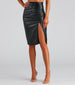 Listen. this faux leather midi skirt will surely level up your look! It features a high-rise waist. front ruched seam atop a sultry slit. a bodycon silhouette. and back zipper closure. Complete the look in a printed bodysuit for a fab night out.