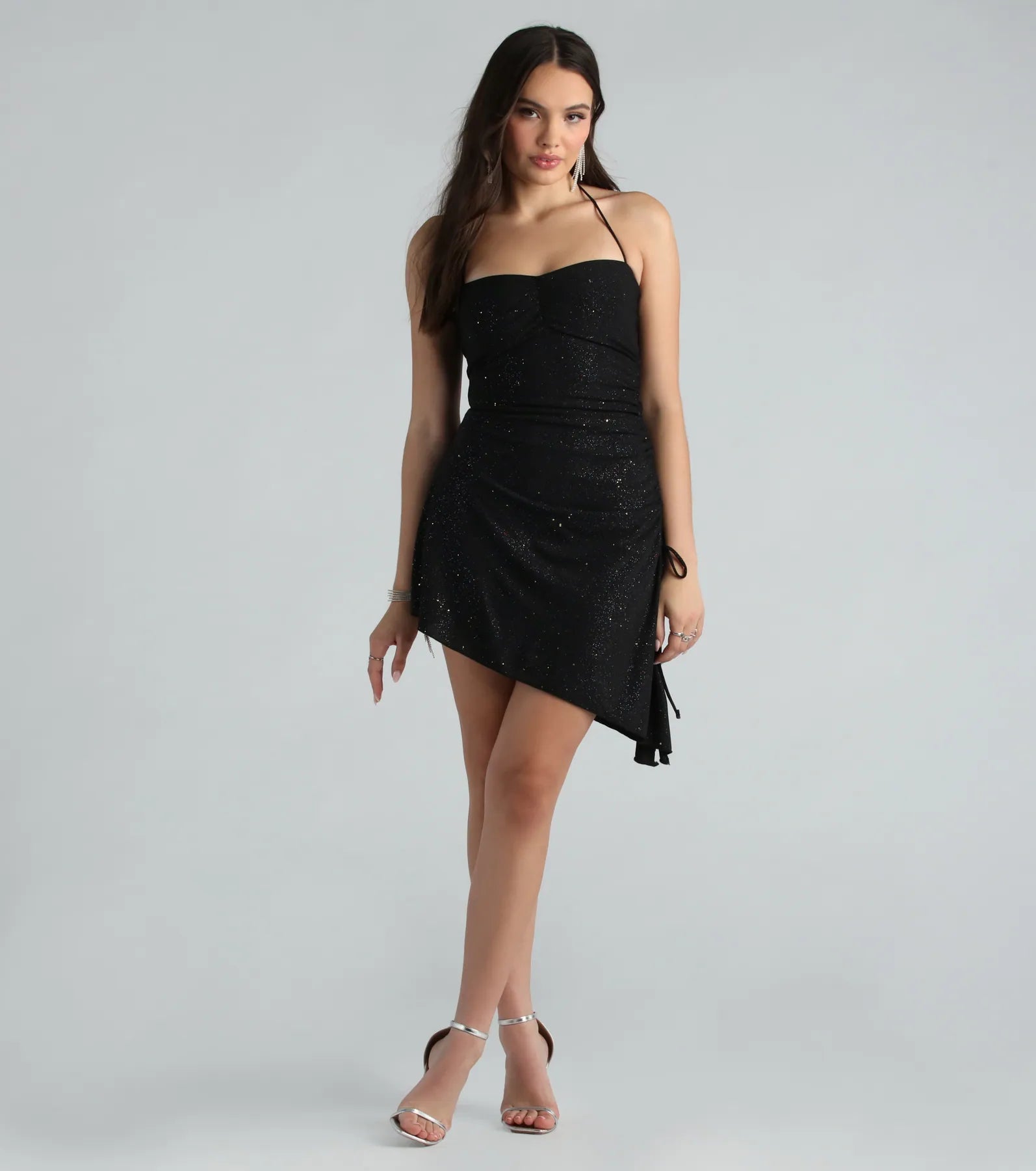 Live your best life in this glitter mini dress for birthdays or dressy nights out! The short dress features a halter neckline with tie-back closure. a ruched bust seam. a form-hugging fit. an asymmetrical mini-length hem with a flirty side slit. and an adjustable side drawstring so you can customize the style. The mini dress is crafted from a rainbow glitter mesh fabric with a stretchy knit lining. Complete the look with platform heels.