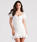 Look like a daydream come true in this eyelet lace mini dress for your next date! It features adorable puff sleeves with ruffle trim. a sweetheart neck. a ruched bust seam. and a bodycon silhouette with a flirty tiered ruffle hem. Complete the look in cute stiletto heels.