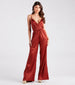 Give off a luxe aura in this chic satin wide-leg jumpsuit! It features a sleeveless V-neckline with a pleated wrap-front design. adjustable spaghetti straps for a customized fit. a high-rise cinched waist with an adjustable tie-front detail. and a wide-leg silhouette. The smooth satin fabric will showcase a stunning sheen. Style with platform heels for date night.