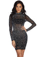 Glow on like the star you are in our show stopping Lorelei black dress! She features a mock neck. unlined long sleeves and a party ready mini length silhouette. Lorelei is composed of a sheer mesh fabric adorned with sparkling heat stones and gemstones for dazzling shine! Lorelei offers a form hugging fit with a moderate stretch. Dress includes a partial skirt lining and back zipper closure. Undergarments not included.