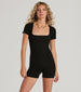 Get obsessed with leisurely days when all you need is this rib knit romper and an iced latte! Crafted with a stretchy rib knit fabric. this romper will keep you feeling snug all day long with its perfect form-hugging fit. Featuring short sleeves. a square neckline. and a short-length hem. you'll love running errands or lounging in it. Complete the look with sneakers and a cropped jacket.