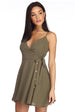 You'll look like a total beauty in this lovely little linen dress! It features a sleeveless bodice. adjustable spaghetti straps. a V neckline created by a wrap front. a side tie detail. a back zipper and hook and eye closure. and a wrap skater skirt with a faux button down front. The olive green dress is composed of a linen fabric with a short linen lining and offers a flowy fit.