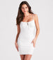 Loving this eyelet lace mini dress is easy! Perfect for lunch with friends or bridal showers. The dress features a sleeveless square neck. spaghetti straps. a ruched bust tie. and a bodycon silhouette. Complete the look in trendy sandals.