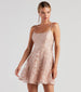 You'll be the center of attention in the stunning Lucia party dress! She features a sleeveless scoop neckline with a padded bust and a structured bodice. adjustable spaghetti straps. and an alluring open back with a lace-up strappy design for a customized fit. Her high waist seam flows out to a short party skirt with a fit and flare silhouette. The lined lace fabric features a metallic thread woven throughout. Style this dress with glitzy earrings.