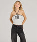 Showcase your lucky number in this strapless tube top perfect for those off-duty days! This bold top features a striking contrast trim strapless neckline with a playful tie. and a statement-making thirteen graphic. and a cropped hem. Complete the look in jean shorts and sandals.