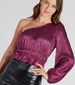 Revel in the luxurious shimmer of this metallic crop top. Its metallic pleated fabric. smocked crop hem with ruffle trim. and one-shoulder cut with a peasant long sleeve exude an irresistible effortless elegance. Complete the look in a mini skirt for a party!