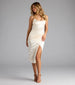 Step out in the chic Mabel satin midi dress designed with a lace-up back that turns heads and a front wrap slit for effortless movement.Â