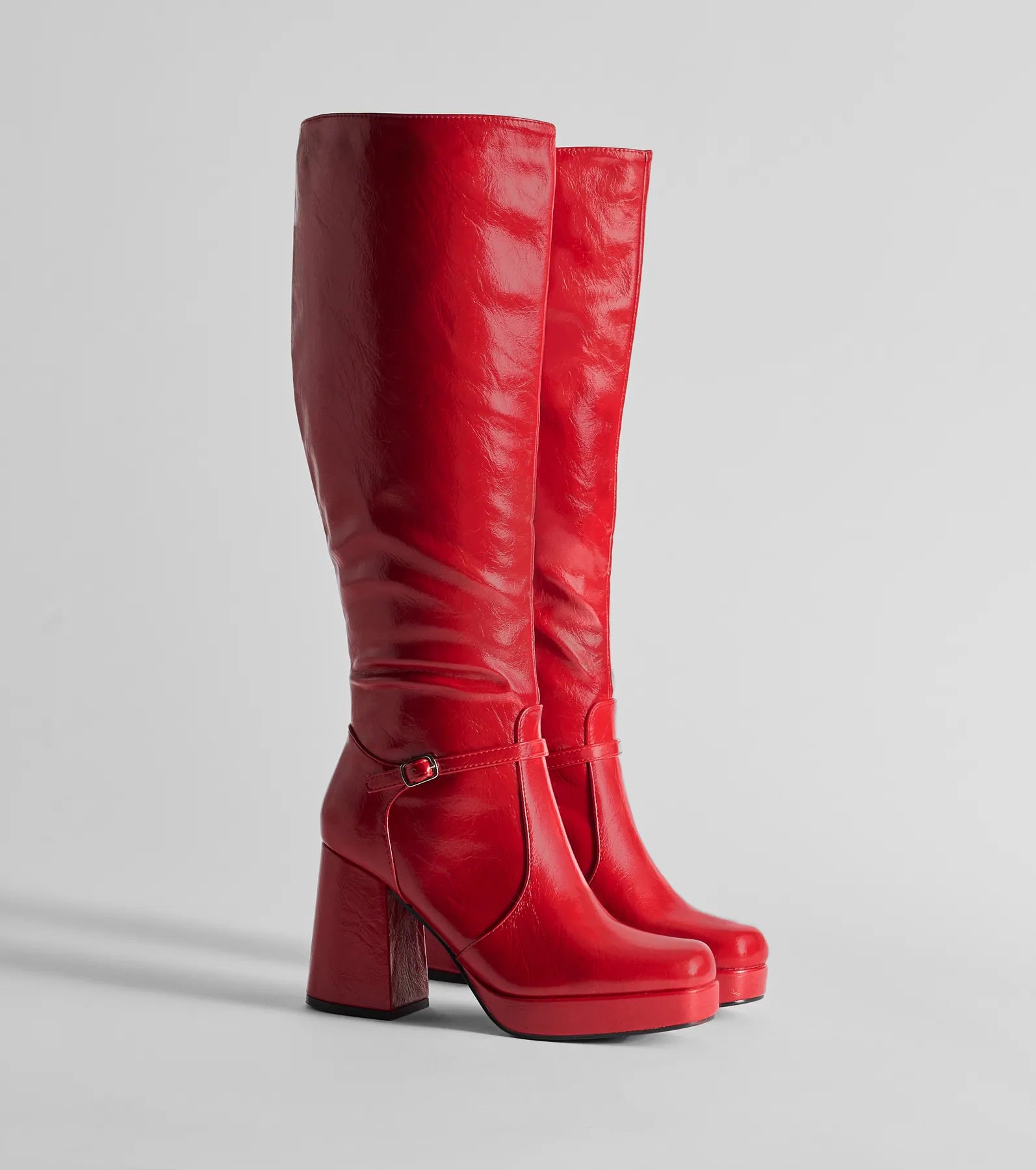 These sleek patent faux leather boots were made to strut. designed with a bold under-the-knee height and a chic buckle strap accent. They feature a square-shaped toe. a complete inner zipper closure for effortless styling. and a sturdy wide block heel.