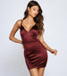 Look oh-so-stunning for your next night out in the Madeline sleek satin mini dress! She features a sleeveless V-neckline with a padded bust. dual spaghetti straps leading to a strappy lace-up back design. ruching at the back. and a mini-length. bodycon silhouette. Complete the outfit with clear heels.