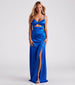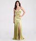 Make a showstopping entrance in the always stunning Maisy satin formal dress! She features a sleeveless V-neckline with a twist-front design. spaghetti straps. an alluring front cutout at the waist. and a floor-sweeping A-line silhouette with a chic high side slit to show off some leg. The satin-knit fabric showcases a luxe sheen for a glamorous vibe. Style with rhinestone heels for your next gala!