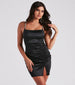 Make it your moment to flaunt your sultry style in this sleek satin mini dress! It features a sleeveless square neckline. chain-link shoulder straps with sparkly mini rhinestone embellishments. front ruching leading to a chic slit. and a mini-length. bodycon silhouette that will hug your curves. The satin-knit fabric offers a moderate stretch. Complete the look with strappy stilettos.