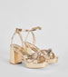 Make it your moment as you strut into the party wearing these metallic platform heels! They feature an open square toe. a knotted strappy design across the foot. an adjustable ankle strap. a heel strap. a platform sole. and a tall block heel. The metallic sheen will catch everyone's eye. Complete your look with rhinestone fringe earrings.