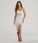 Celebrate in the most stunning way by wearing the Marcel formal midi dress as the sultry bride. birthday babe. or party guest! Made from lined mesh fabric adorned with countless iridescent rhinestones and faux pearl embellishments. you'll be invoking a major glam factor! She features a sleeveless sweetheart neckline with chic cowl draping. adjustable spaghetti straps. a sexy cutout bodice to flaunt some skin. a bodycon silhouette that flatters your curves. and a front slit along the midi-length hem. Complete the look with dangly earrings and heels.