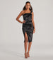 Chic and cute. the Matilda satin formal dress is ready to make you the talk of any banquet or wedding! Made from a luxurious silky satin fabric this formal dress will feel so exclusive and sleek. She features a flattering one-shoulder neckline. a form-hugging silhouette accentuated with a side pleated seam. a front wrap slit. and a midi-length hem. Complete the look with rhinestone earrings and stiletto heels.