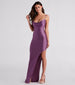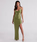 The Melina formal dress has an eye-catching sheen that will capture everyone's gaze when you enter the room! She features a sleeveless cowl neckline with a built-in padded bust. spaghetti straps. a form-fitting silhouette that will hug your curves. and an asymmetric floor-length hem creating an alluring thigh-high side slit to showcase some leg. The smooth knit fabric offers plenty of stretch. Style with platform heels for your next fancy party.