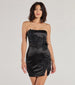 You'll be a chic stunner in the Meriah formal mini dress designed with sleek satin knit fabric and a sheer tulle floral applique across the bodice and at the hem for luxe look. It features a strapless straight neckline and a short bodycon silhouette to highlight your curves.
