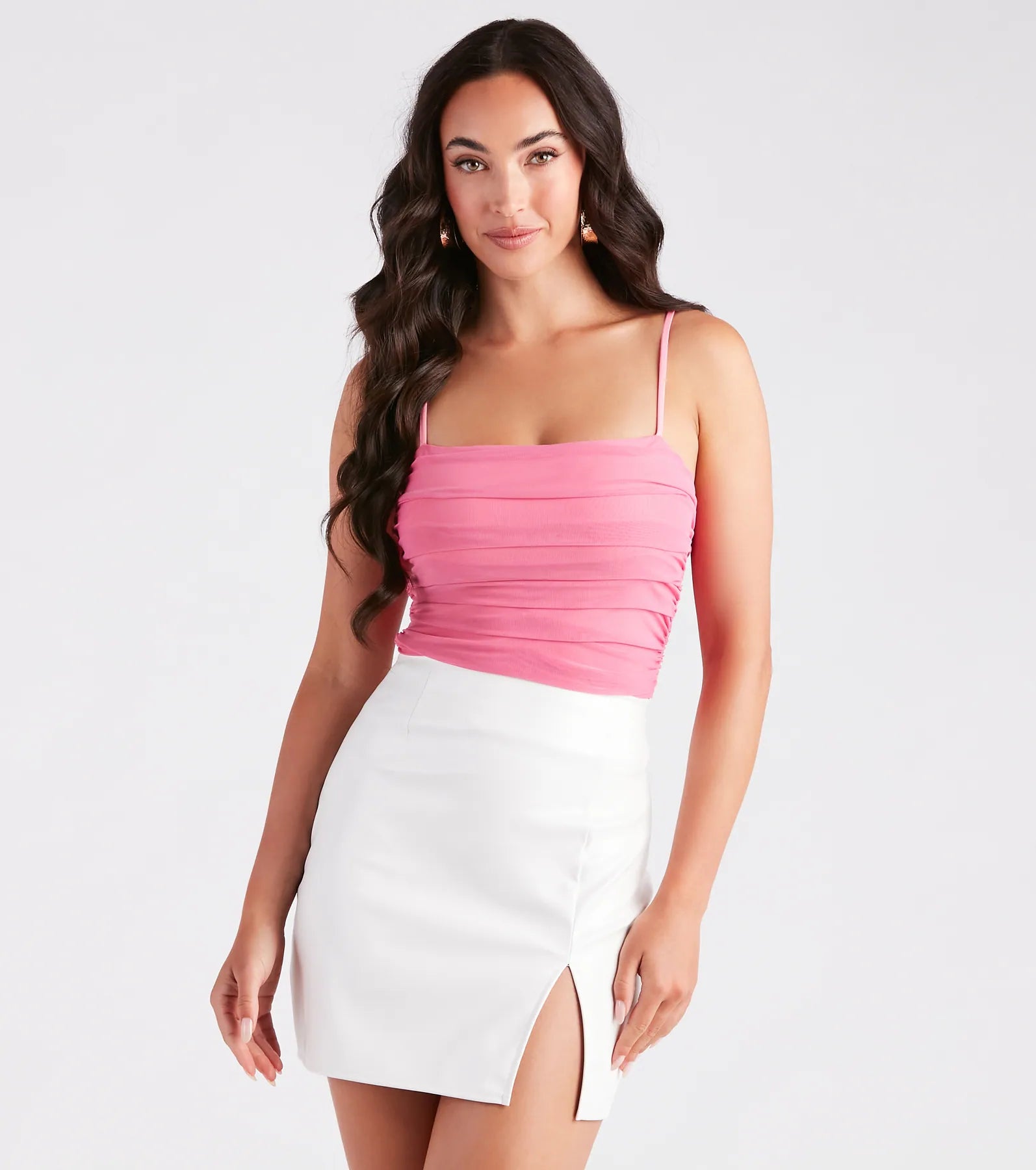 Don't mess around cause this crop top won't be here for long! Add-to-cart this cute top to style with your day or night wear. It features a sleeveless square neck. adjustable spaghetti straps. side. and back ruched seams. and a mesh overlay with a sewn-in knit lining. Complete the look in a sleek mini skirt for dinner and drinks!