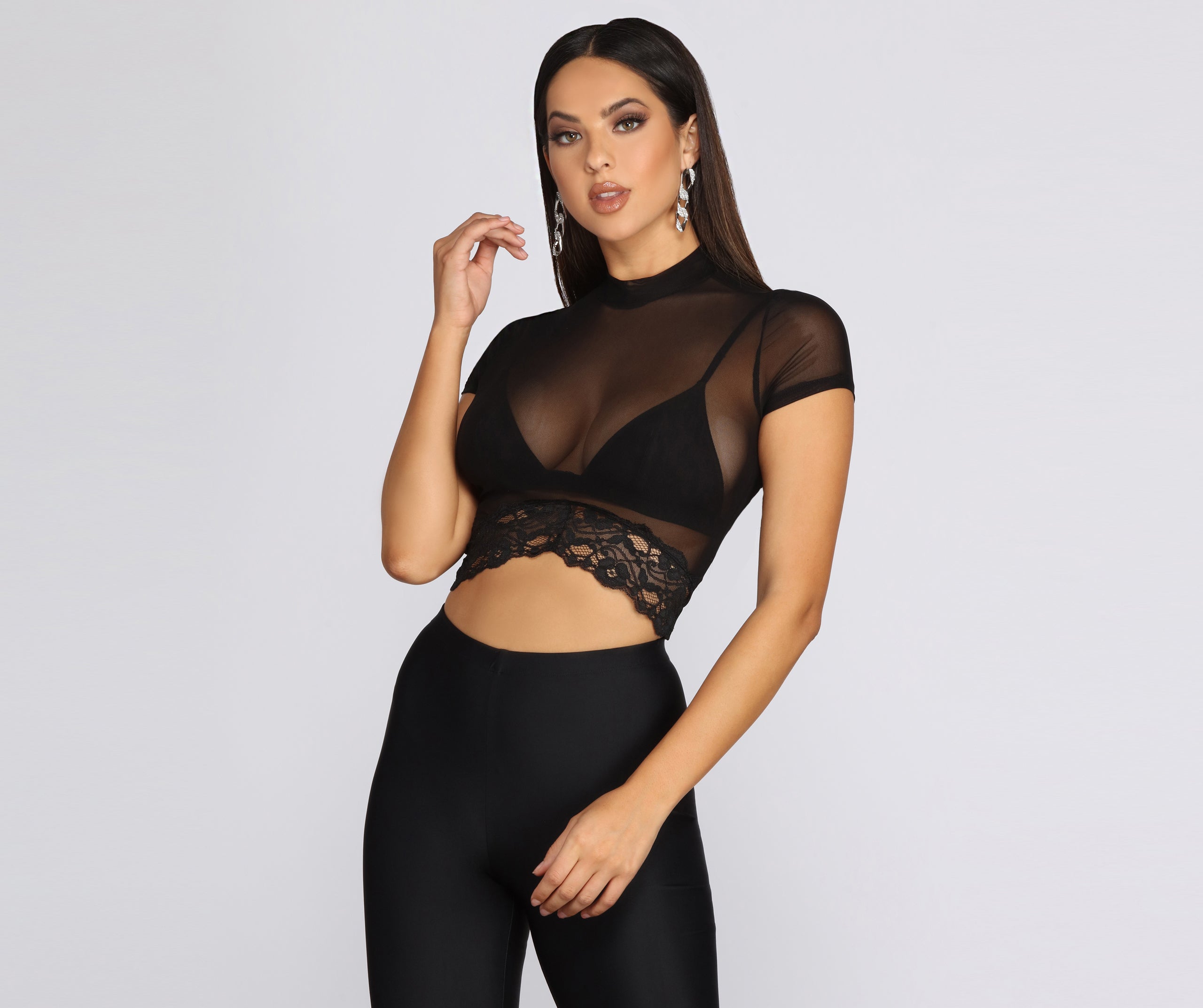 Don't be afraid to mess with this tee! It has a basic crew neck. cap sleeves and a slim fit. The garment is composed of a sheer. unlined mesh. detailed with a wide lace hemline.