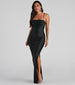 Show off a hint of leg in our sultry Mila dress! She features a sleeveless trendy square neckline. adjustable spaghetti straps. ruched side seams. and a floor-length. curve-hugging silhouette with a thigh-high side slit. Style this dress with a pair of sleek stilettos and lots of shine for an A-list look!