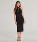 Classic with a chic allure. the Mina formal midi dress is a stunning staple for cocktail parties. It features a sleeveless high neckline with mesh ruching at the bust and a sultry cutout. ruched mesh panels down the sides to highlight your gorgeous curves and a midi-length bodycon silhouette accented with a back slit.