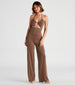 Make the whole place shimmer sparkling in this halter glitter jumpsuit featuring a sleeveless bodice. drawstring neck with tie closure. a front keyhole cutout. and a straight-leg silhouette. Complete your radiant look in earrings for a cocktail dinner!