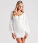 A modern take on a romantic silhouette! This eyelet lace mini dress is cute for bridal showers or casual day dates. It features long peasant sleeves. a square neck. a ruched bust. and a form-hugging silhouette. Complete the look in chic lucite block heels.