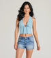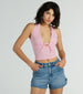 This halter crop top will put you in the mood for love and all things lacey! The plunging V-neckline. lace trim details. and tie-front bust create a sultry look. while the stretchy rib knit fabric ensures comfort. Exude confidence and style in this halter top paired with new high-rise denim jeans and mules for a casual date!