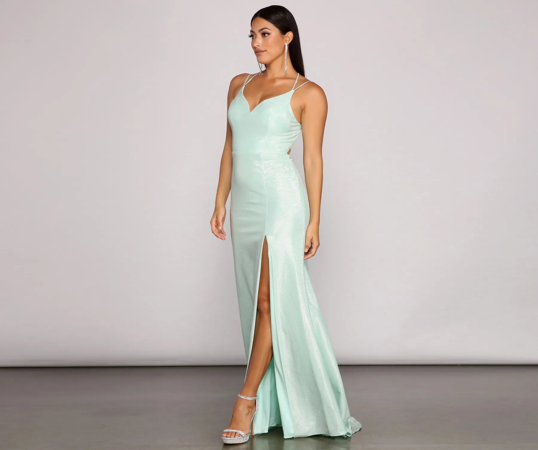 Bring the glow to your evening with a formal dress that illuminates the night. The dress features a sleeveless V-neckline. a double row of adjustable spaghetti straps. a lace-up back design. a high side slit. and a flowy A-line silhouette. The dress is composed of a lined glitter knit fabric that offers a form-hugging fit. Complete the look with glitter heels and a rhinestone clutch.