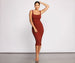Get your need for basics in a dress that can be dressed up or dressed down for your next day out. The dress features a trendy square neckline. tank-like straps. and a midi length silhouette. Complete your look with clear heels and statement hoop earrings.Â