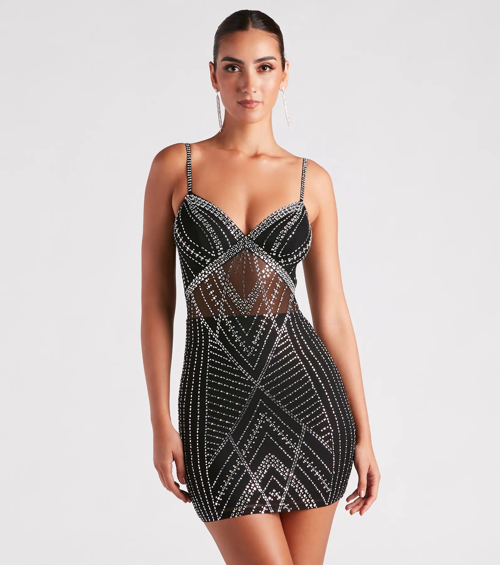 Pretty girls walk like this in the Nessa party dress! Radiate glamour at birthday celebrations. school dances. or a bachelorette. She features a sleeveless V-neckline with rhinestone gem trim. adjustable spaghetti straps. a sultry sheer bodice. and a bodycon silhouette with a mini-length hem. The formal dress showcases glitzy all-over rhinestone embellishments in a figure-flattering pattern on mesh fabric with a stretchy knit lining. Complete the look in platform heels and fringe earrings.