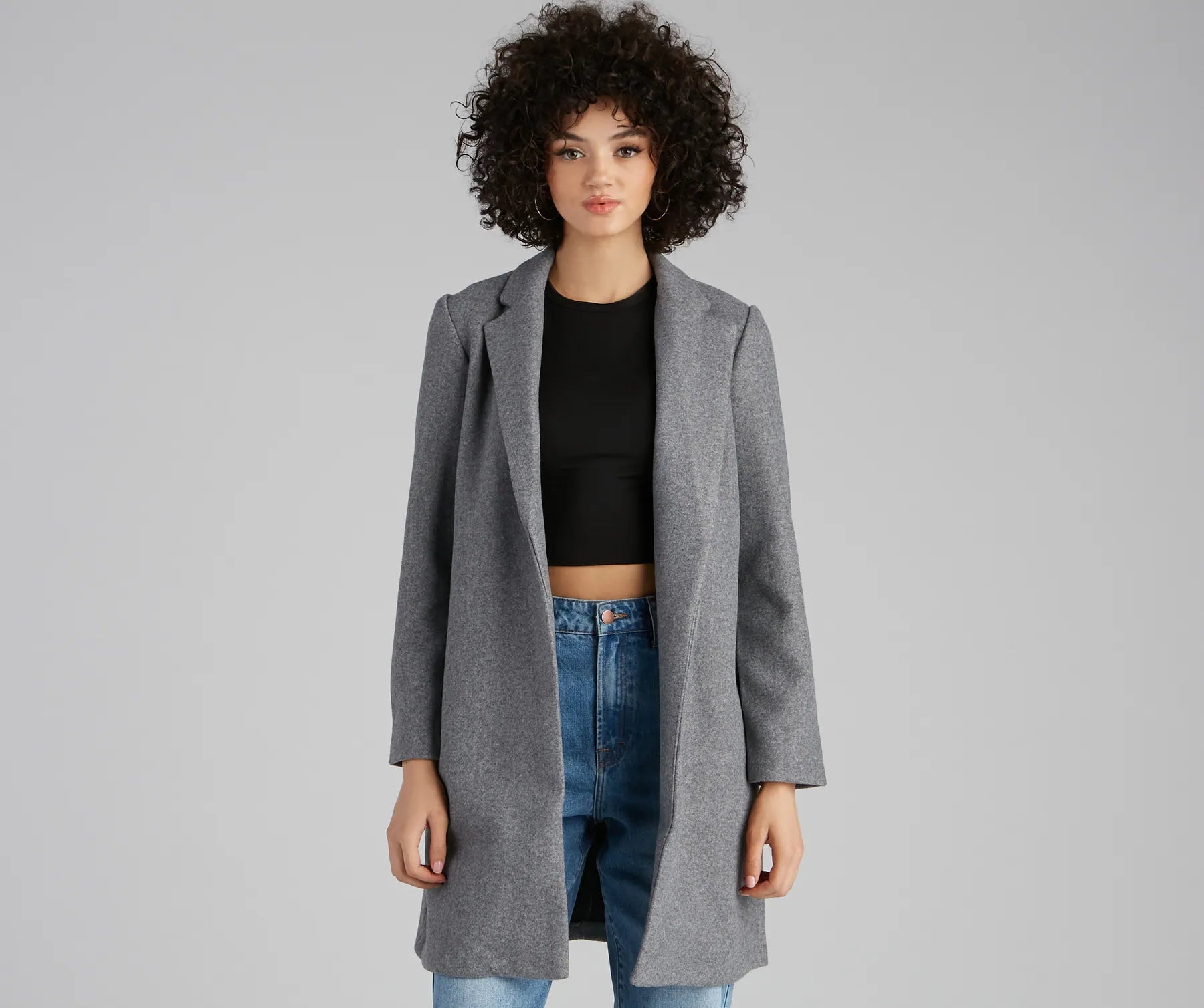 Winter's coming to the big city and this trench coat is a chic option! Featuring long sleeves. a collared neckline. an open-front design. side pockets. and a long-length hem. Composed of soft faux wool fabric with minimal stretch. Perfect for styling with a cute beret.