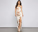 You'll look oh-so-gorgeous in the flirty floral Nicole formal dress! She features a sleeveless square neckline. spaghetti straps that lead to a cross-back design. a flattering high waist seam. and a floor-length. fitted silhouette with a thigh-high front slit accented with ruffle detailing. Complete the outfit with basic block heels.