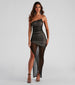 Have your chic moment in this mesh maxi dress featuring a sultry. one-shoulder neckline. a partial open-back. side and back ruching. and an asymmetrical maxi-length hem with a side slit cutout. Complete your dressy look in sleek heels.