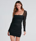 Link up with this mesh mini dress for a stunning look at rehearsal dinners or cocktail parties! The dress features a square neck. sheer fitted long sleeves covered in faux pearl embellishments. a sheer back with a keyhole accent and button closure. side ruched seams to accentuate your curves. and a bodycon silhouette. Complete the look with earrings and block heels.