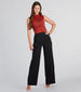 Create the perfect look with these belt-detail trouser pants for an elevated vibe. They feature a high-rise waist. a front faux belt design with a chic rectangular-shaped buckle. a vertical front seam down both legs. a hip-hugging fit. and an on-trend straight-leg silhouette. Style these chic pants with an embellished bustier and clear heels for a dressy dinner!