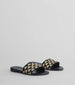 Step out in style in these faux leather flat sandals. These sandals feature a round toe and a woven strap with a quirky triangle print. perfect for adding a touch of fun to your outfit while the faux leather flat sole ensures all-day comfort. Complete the look with a trendy handbag.