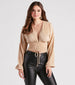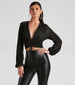 Posh and pleated. this long sleeve crop top is a fall must-have. It features a deep V-neckline. long peasant sleeves. a cinched front design with a drawstring. and a cropped. form-hugging fit. The trendy pleated knit fabric offers a moderate stretch. Style with faux leather pants and heels.