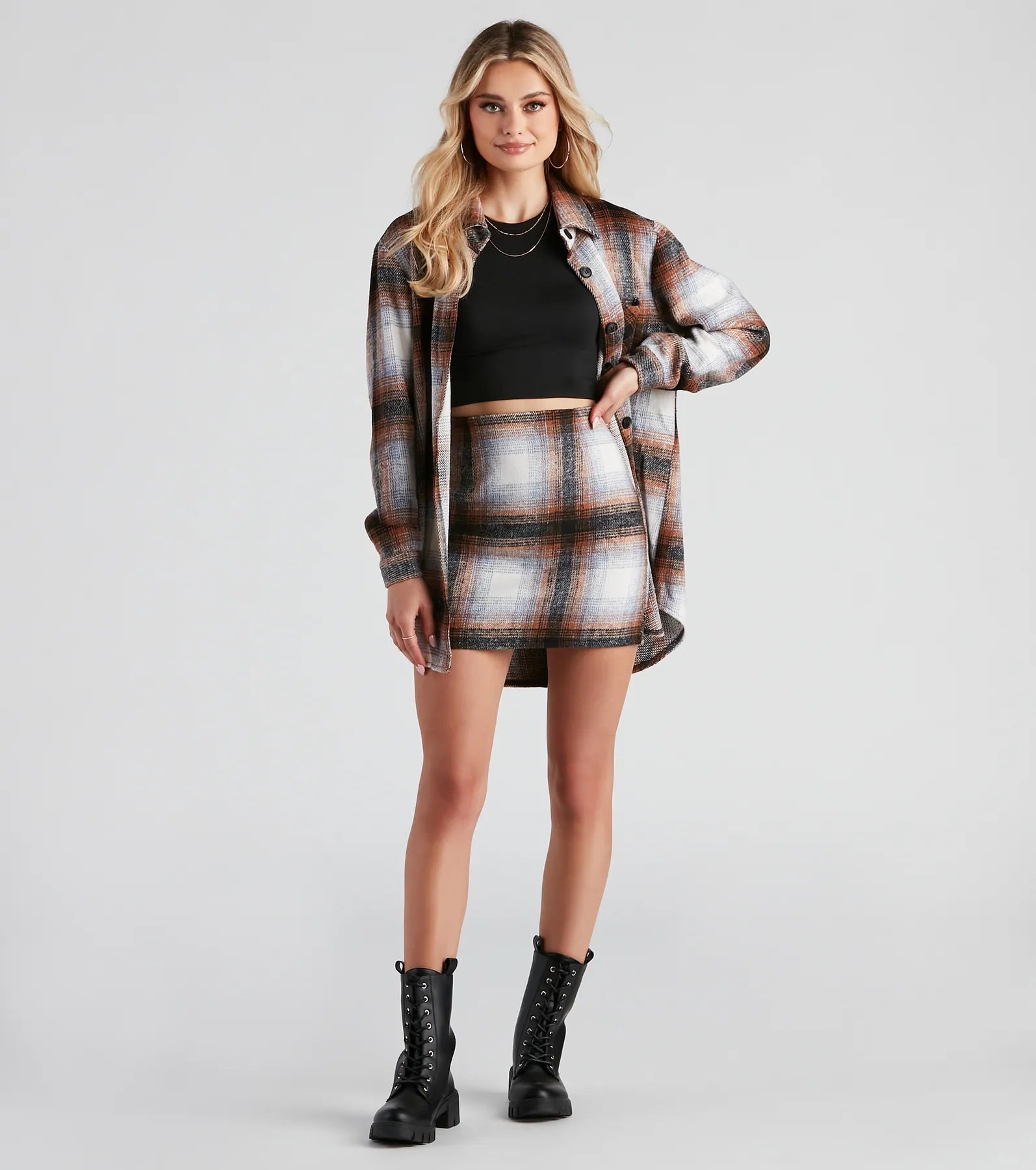 Keep it preppy and cute with a skirt that is perf for grabbing your PSL in! The skirt features a plaid print. a high-rise waist. a mini-length silhouette. and a back zipper closure. The skirt is composed of a wool-like knit fabric that offers a form-hugging fit with minimal stretch. Complete look with matching the shacket.