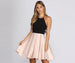 Too pretty. too posh! This dress features a contrasting bodice and and a skater design. It has a halter neck tie closure. a satin skirt and an open back. Fully lined with no stretch.Â