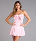 Playful yet polished—this strapless mini dress stuns with a statement bow and flirty fit-and-flare silhouette. The cutest party dress for birthdays. date nights. or homecoming!