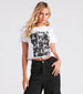 Level up your 'fit for a concert or a bar outing with this edgy punk rock graphic tee! It features a crew neckline. short sleeves. multiple front punk rock-inspired graphics. a cropped hem. and a relaxed fit. The cotton fabric offers a moderate stretch. Style with cargo pants and sneakers to keep it casual. or a faux leather mini skirt and booties for a sleek vibe.