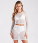 Have a glamorous night looking like a queen in this mesh crop top featuring fitted long sleeves. a crew neck. and all-over rhinestones and faux pearl embellishments. Complete the look with matching bottoms and heels.