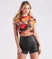 Cross the finish line in this stylish racer graphic crop tee perfect for showing off your trophy! It features short sleeves. a crew neck. a fitted hem with wrap ties. and an edgy racecar graphic design. Complete the look in sleek faux leather shorts for a backyard bbq!