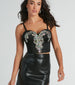 Strike a radiant look tonight in this rhinestone bustier out on the town! Showcasing a flattering sweetheart neckline adorned with an iridescent rhinestone and beaded embellished applique going down the center of the top. The padded bust and flexible boning add structure for a snatched silhouette. The adjustable spaghetti straps and back hook and eye fasteners provide a secure and customizable fit. and the straps are removable to make the bustier strapless. Complete the look in a mini skirt and strappy sandals.