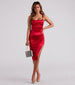 You'll look so radiant in this satin midi dress to make a stunning appearance at cocktail parties and date nights! It features a sleeveless cowl neckline with pleating. spaghetti straps. a strappy back design. a form-hugging silhouette. and a side slit. Complete the look in stiletto heels.