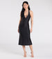 The smooth knit dress features a sleeveless halter neckline. mini bar strap accents at the bust with metal hardware. a flared mermaid silhouette. and a midi-length hem. Complete night out look with metallic heels.