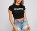 Let this top say it all! The crop top features a crew neckline. short sleeves. a graphic that reads "Reserved". and a cropped hem. The top is composed of a cotton knit fabric that offers a relaxed fit with a moderate stretch. Complete look with denim shorts.