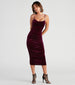Turn heads in the glamorous Rhonda formal velvet dress for your next holiday party or celebration! She stuns in a sleeveless V-neckline. spaghetti straps. padded cups. and side ruched seams to accentuate your curves along her form-fitting. midi-length hem. The formal dress is composed of luxurious velvet fabric. Complete your dressy look in lattice cutout booties and earrings!
